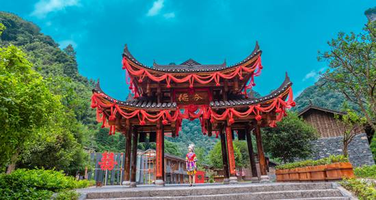 在風景秀麗的湘西武陵源風景區(qū)內(nèi),鑲嵌著一顆璀璨的明珠——德夯苗族村?!暗潞弧睘槊缯Z,意為美麗的峽谷,距湘西自治州首府吉首市約24千米。這是一塊神奇的土地,這里溪流縱橫,峽谷深壑,瀑布飛瀉,落差達216米的流紗瀑布,如白練凌空,似銀紗懸壁。這里群峰競秀,盤古峰海拔700多米,峰頂呈葫蘆狀,分大小兩峰,絕壁千仞,天險難度,站立峰頂,方圓景色盡收眼底。這里有著名的公路奇觀,這便是湘川公路上最險關(guān)卡——矮寨天險,從山麓到山頂全長只有6千米,卻轉(zhuǎn)了13道彎,公路如白帶盤旋于青山之上,車行路上,伸手可抓到窗外白絮般的云霧。德夯距湘西自治州州府吉首市,屬省級風景名勝區(qū)。這里山勢跌宕,絕壁高聳,峰林重疊,形成了許多斷崖、石壁、瀑布、原始森林。區(qū)內(nèi)溪河交錯,四季如春,氣候宜人,有豐富的動、植物資源,自然風光秀麗迷人。自矮寨鎮(zhèn)沿溪上行4公里至德夯苗寨,沿岸筒車、水輾、古渡、小舟,伴以苗家吊腳樓,一派田園詩情。九龍溪穿寨而過,四周山色清幽,懸崖如削。過石拱橋可登盤古峰,峰高400余米,山巔有大、小兩峰,頂寬約5公頃多,為盤根錯節(jié)的原始森林,四周絕壁,站立峰頂,方圓景色盡收眼底。