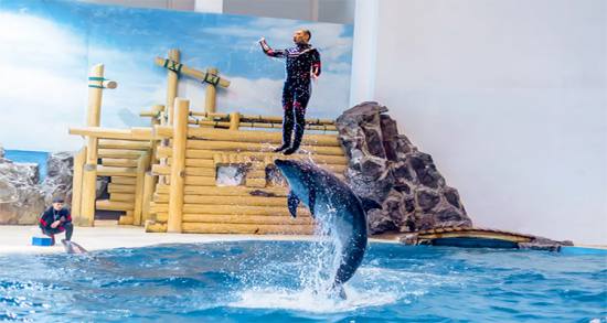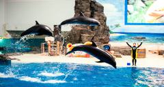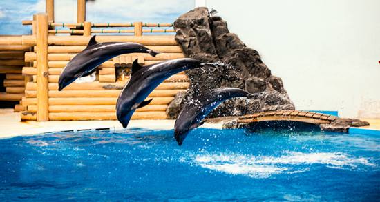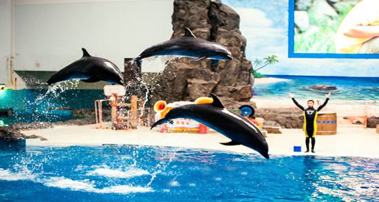 極地館:主要為極地動物區(qū),分為白鯨池、海獅池、海豚池、海豹池、企鵝池、水獺池等水生生物展示休息表演池,以及北極狼舍、北極狐舍等陸生生物展示休息籠舍。館內(nèi)建有一個高大寬敞明亮,音響等設(shè)備設(shè)施先進配備LED大型顯示屏的表演劇場,可供1800多游客同時近距離觀賞海豚、海獅等精彩表演。